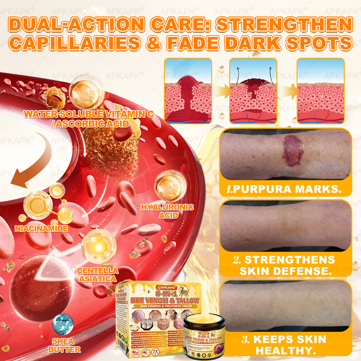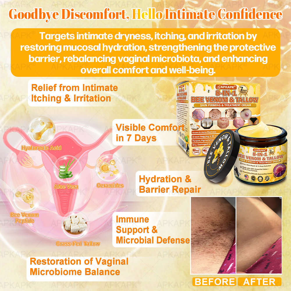 In response, APKAPK® 8-In-1 Bee Venom & Tallow Skin Firming & Treatment Cream was scientifically developed under rigorous standards. Its formula combines the restorative power of natural bee venom and grass-fed tallow, synergized with hyaluronic acid, collagen, vitamin C, centella asiatica, and over ten other potent bioactive ingredients. Together, they deliver multi-dimensional care â from deep hydration and barrier repair to anti-inflammatory relief, itch control, metabolic renewal, tissue restoration, and anti-aging nourishment. Clinically validated and produced in GMP-certified facilities compliant with U.S. and EU safety standards, this cream offers a safe, effective, and drug-free multi-repair skincare solution for dryness, inflammation, irritation, and signs of aging â restoring comfort, resilience, and lasting skin health.